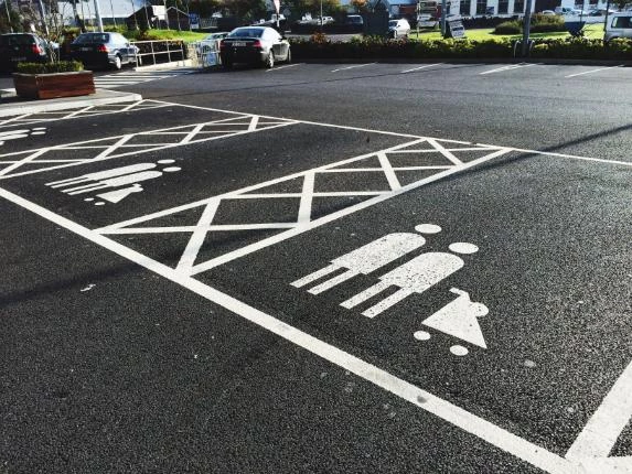 Disabled parking bays are marked according to UK accessibility regulations, including the wheelchair symbol and minimum space dimensions.
